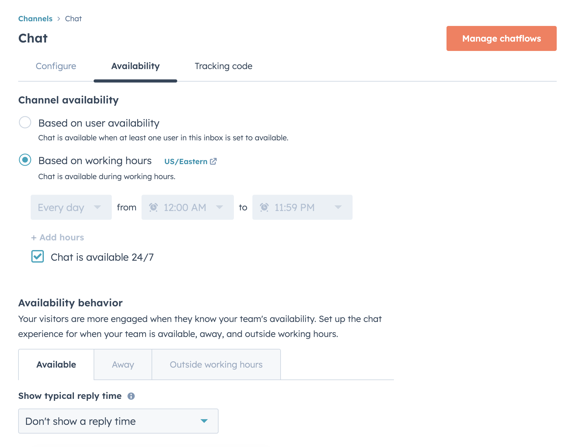 (Recommended - but optional) - Change your chat to show as "available 24/7" and don't show "Typical reply time", you can get to this from: Conversations (drop down) > Inbox > Inbox Settings > Channels: Chat > βEditβ